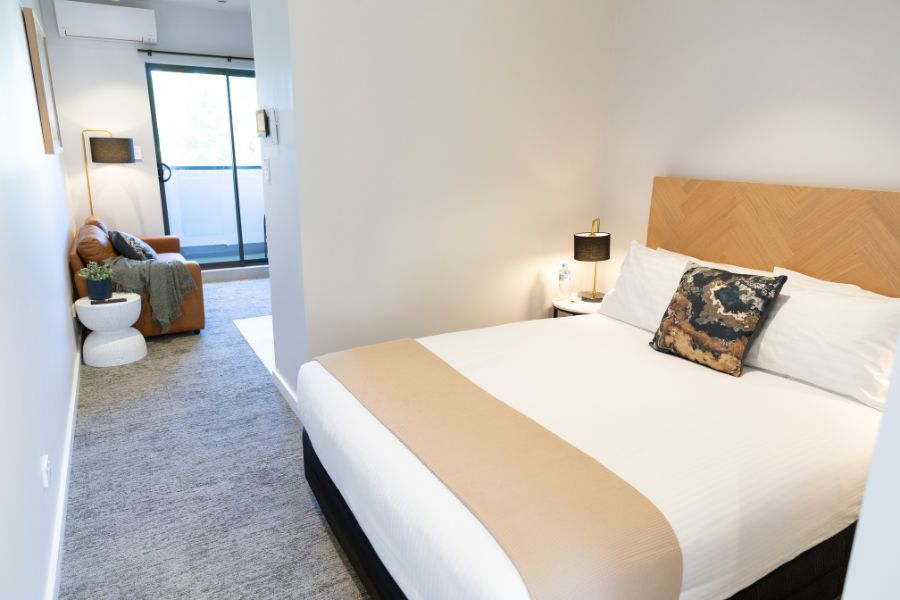Our Studio Apartments are complete with a plush queen bed, kitchenette, private ensuite, laundry facilities and desk. Each room includes a 42cm Smart TV, luxury Smith & Co amenities, complimentary Wi-Fi.